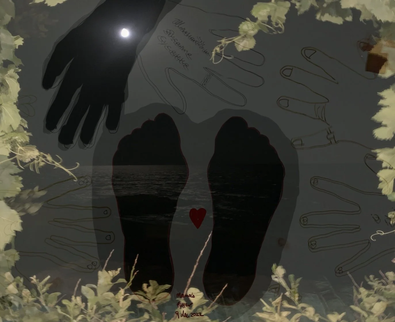 Pliny tells us that the origin of painting was a woman who traced her lover’s shadow on the wall before he left (for war). She did it to hold on to him, knowing he could not stay. Reading this, I realized I had done the same. When my mother was in the hospital, I traced the outline of her feet while she slept. I wanted to hold on. The marks remained. My love remained. She did not.